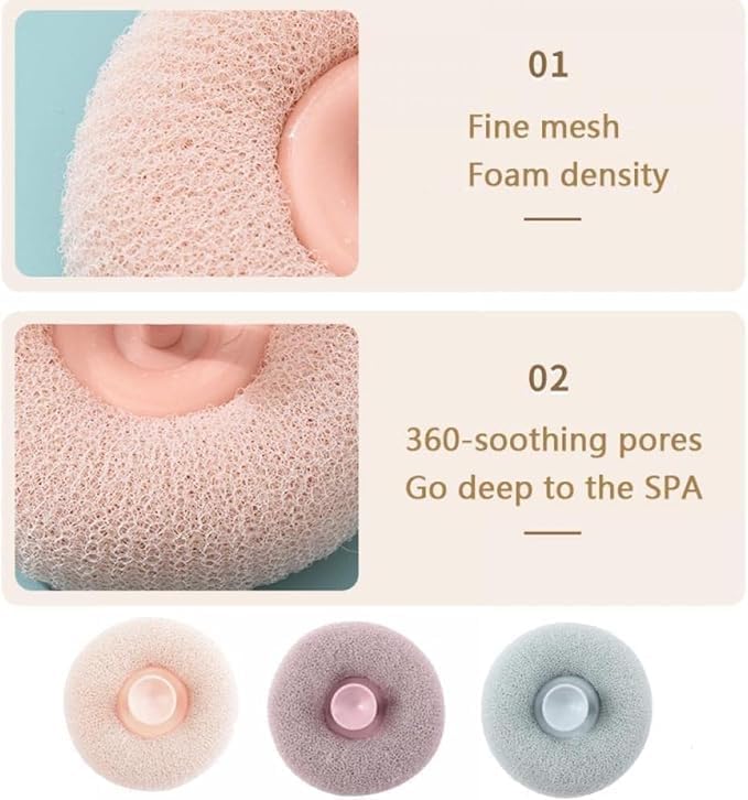 This round bath sponge loofah is ingeniously designed to offer dual functionality in one convenient tool. On one side, the exfoliating loofah fibers delicately scrub away dead skin cells and impurities, promoting healthier and smoother skin texture.