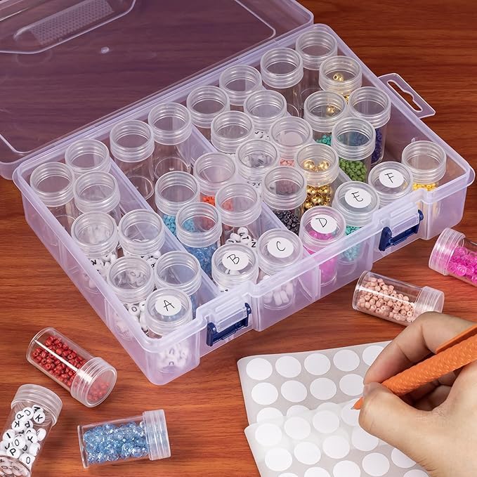 ✅ 24 ROUND BOTTLES WITH LIDS: Includes 24 transparent, spill-proof round bottles with secure screw-on lids. Keep your diamonds, beads, sequins, and glitter neatly sorted and safe from mixing!