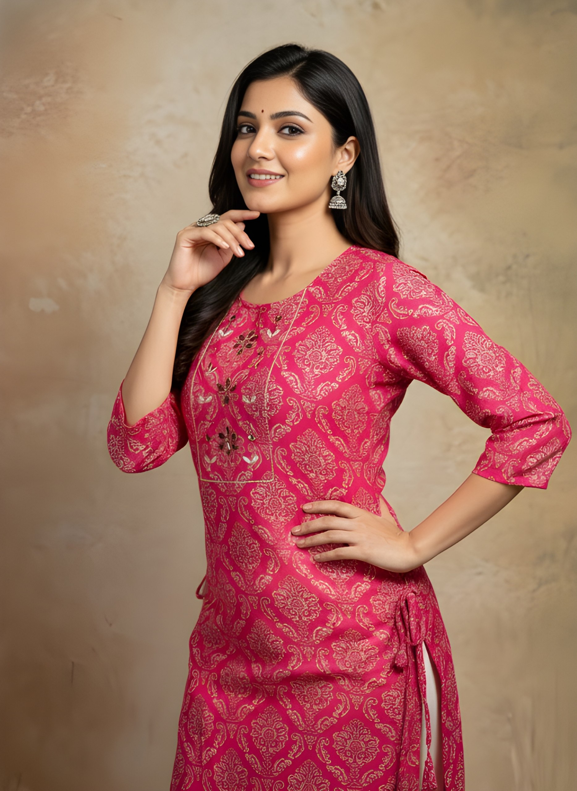 Upgrade your wardrobe with this stylish and comfortable women’s kurti, designed to offer the perfect blend of fashion and comforts. Made from high-quality fabric, this kurti is soft, breathable, and ideal for all-day wear. Whether you're heading to the office, attending a casual outing, or looking for daily wear, this kurti is a perfect choice. Featuring a trendy design with a flattering fit, this kurti enhances your overall look while keeping you comfortable. It can be easily paired with leggings, palazzos, jeans, or pants to create a versatile and fashionable outfit for any occasion.This latest kurti design for women is perfect for those who love modern style with traditional elegance. Suitable for daily wear, office wear, college wear, festive occasions, and casual outings.